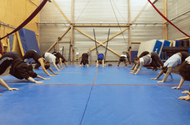 L’acrobatie est la technique de base du cirque grâce au travail de l’agilité au sol. Elle permet la prise de conscience de son corps dans diverses positions, le travail de sa posture, son gainage, sa respiration mais aussi sa relation à l’autre (portés, parades). Faire des acrobaties, c’est avant tout apprendre à piloter son corps dans l’espace.